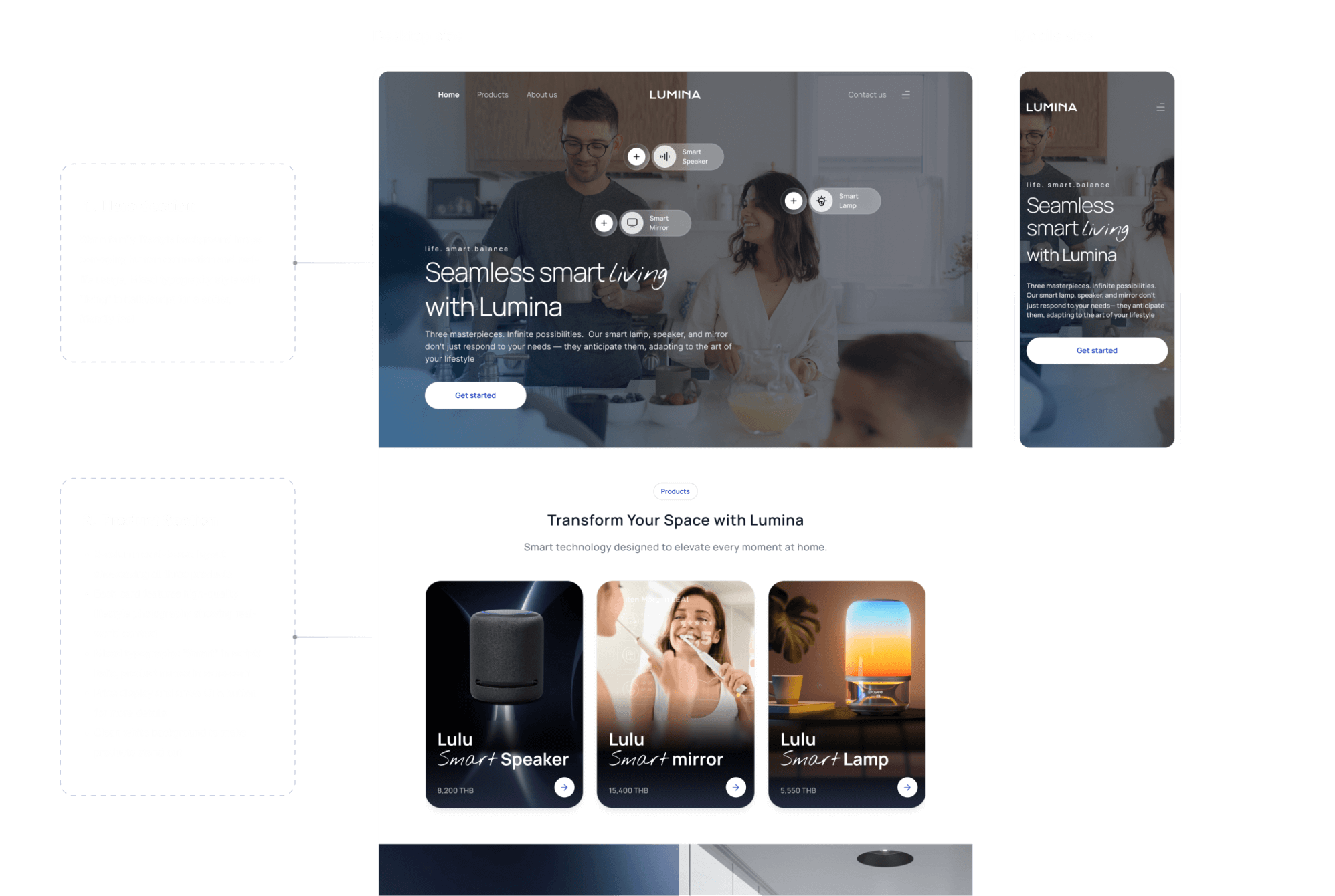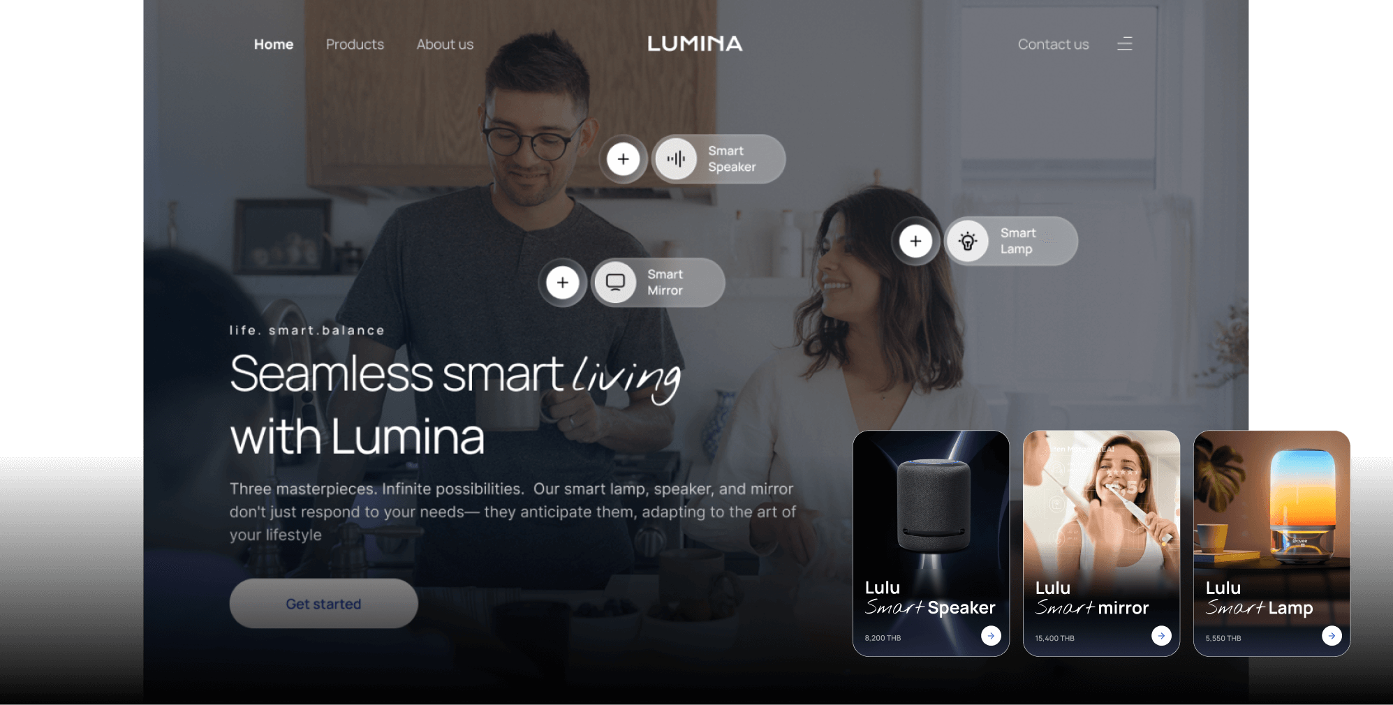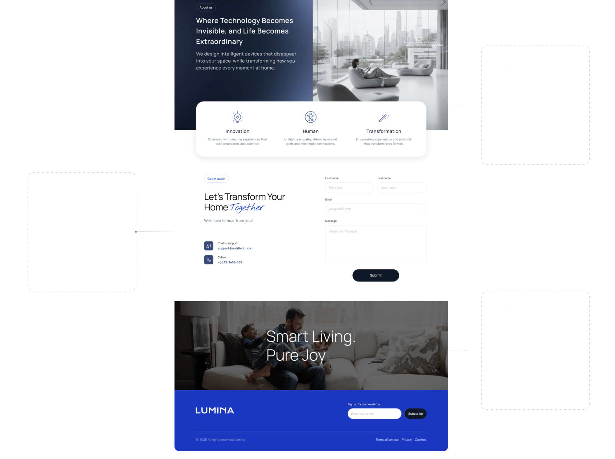 A responsive landing page design for Lumina's smart home ecosystem, showcasing their seamless living technology through clean layouts and immersive visuals. Designed to convert visitors by highlighting product features, brand values, and an intuitive contact form that guides users toward smart home transformation.
